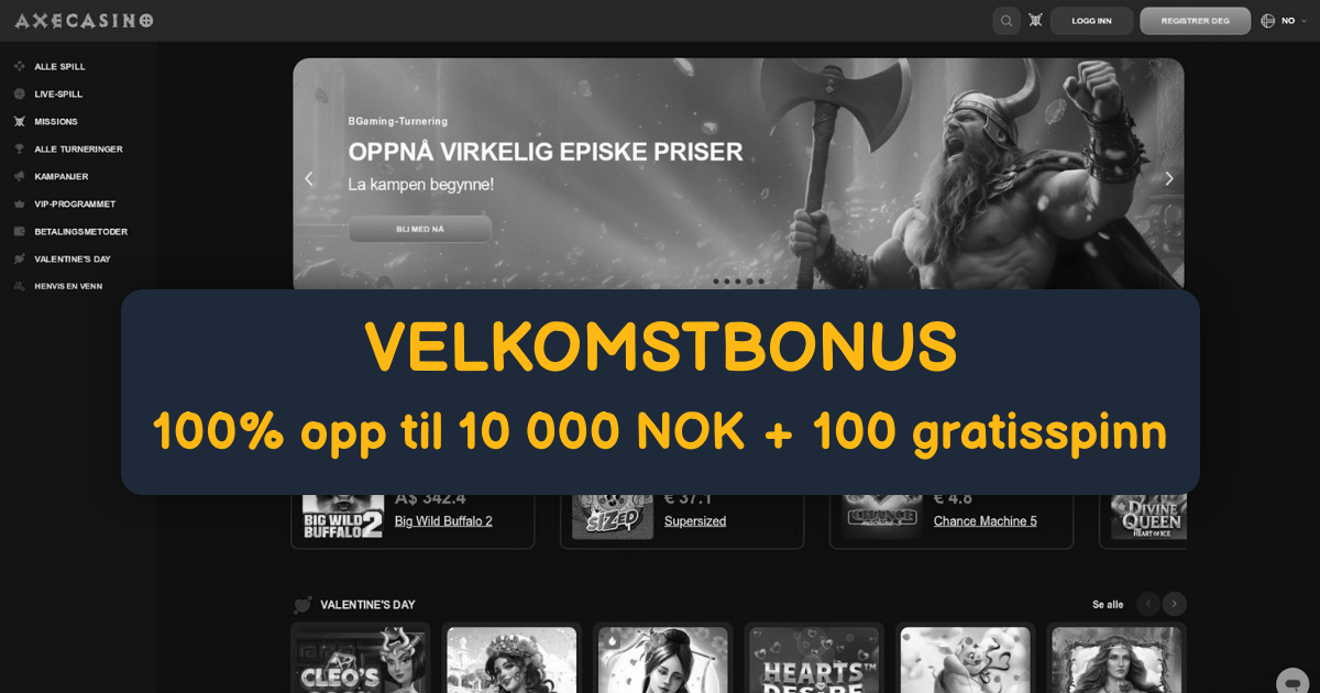 Axe Casino gjør et solid førsteinntrykk med et ryddig, mørkt grensesnitt hvor vikingtemaet er til stede uten å overskygge funksjonalitet. Menyene er intuitive, filtrene er nyttige, og søkefeltet finner raskt både spilleautomater og livebord. For norske spillere som vil inn i et nettcasino uten friksjon, oppleves registrering, innskudd og navigasjon som strømlinjeformet.